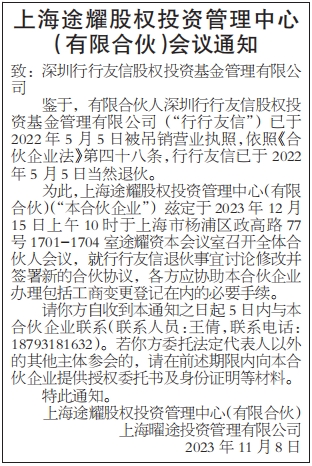 为此,上海途耀股权投资管理中心(有限合伙)(“本合伙企业”)兹定于2023年12月15日上午10时于上海市杨浦区政高路77号1701-1704室途耀资本会议室召开全体合伙人会议,就行行友信退伙事宜讨论修改并签署新的合伙协议,各方应协助本合伙企业办理包括工商变更登记在内的必要手续。